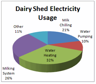 Many dairy sheds consume over 126,000kWh of electrical energy, of which 32% heats water and a further 21% cools milk. At 14 cent per unit this comes to an electricity bill of $17,600 per annum for the milking shed.