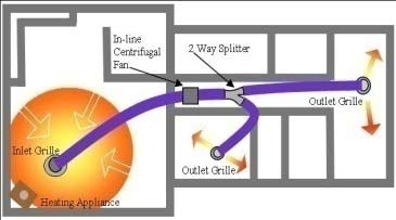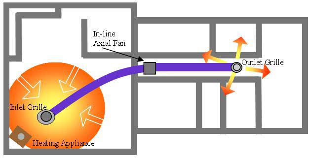 Use the excess capacity of your heat source to warm other rooms in your home. An average size lounge requires 2-4 kW of heating, yet heating appliances such as log burners* can generate 10-20kw. That’s 5 times the amount of heat required for a lounge room. This leaves an excess of 8-16 kW of heat available to warm other rooms in your home. Air trapped at ceiling level can reach temperatures in excess of 30°C so, why not …